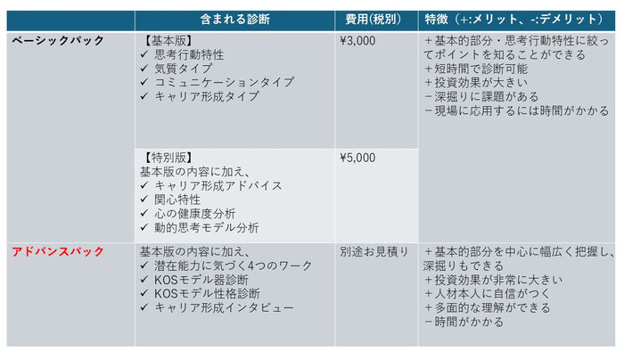 アドバンスパックでは、この気質モデル分析の他、人材の隠れた強みを発掘したり、目に見えない心の状態を把握したりすることのできる診断システムを組み合わせ、現場のニーズに合わせて快適な人材運営・チーム運営をサポートします。